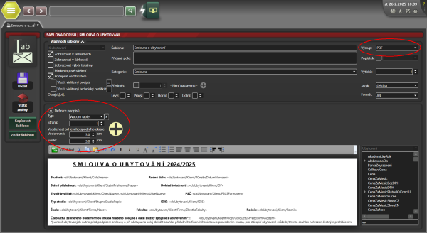 V ubytovacích dopisech je potřeba vybrat příslušnou šablonu (musí mít výstup do PDF) a je-li funkce aktivní, tak je dostupná možnost definovat tyto podpisy. U každého podpisu se definuje typ podpisu (aktuálně je dostupný pouze Wacom) a umístění podpisu na stránce (číslo stránky a odsazení levého dolního rohu podpisového obdélníku zleva a zespodu).